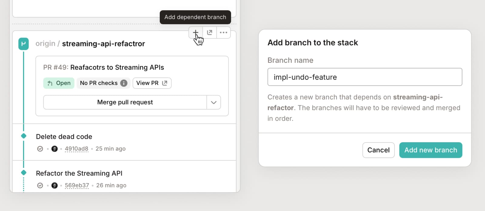 GitButler allows you to create an ordered stack of branches where each branch depends on (and is based on) the previous one. The application also supports creating the appropriate stacked Pull Requests (when used with a GitHub remote). This is useful when you have multiple changesets that depend on each other but it is desirable to have them reviewed and merged separately (and in sequence).