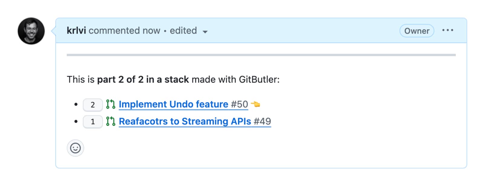 1. The PRs will contain a footer with stack information, and as you add more PRs it will keep all up to date.