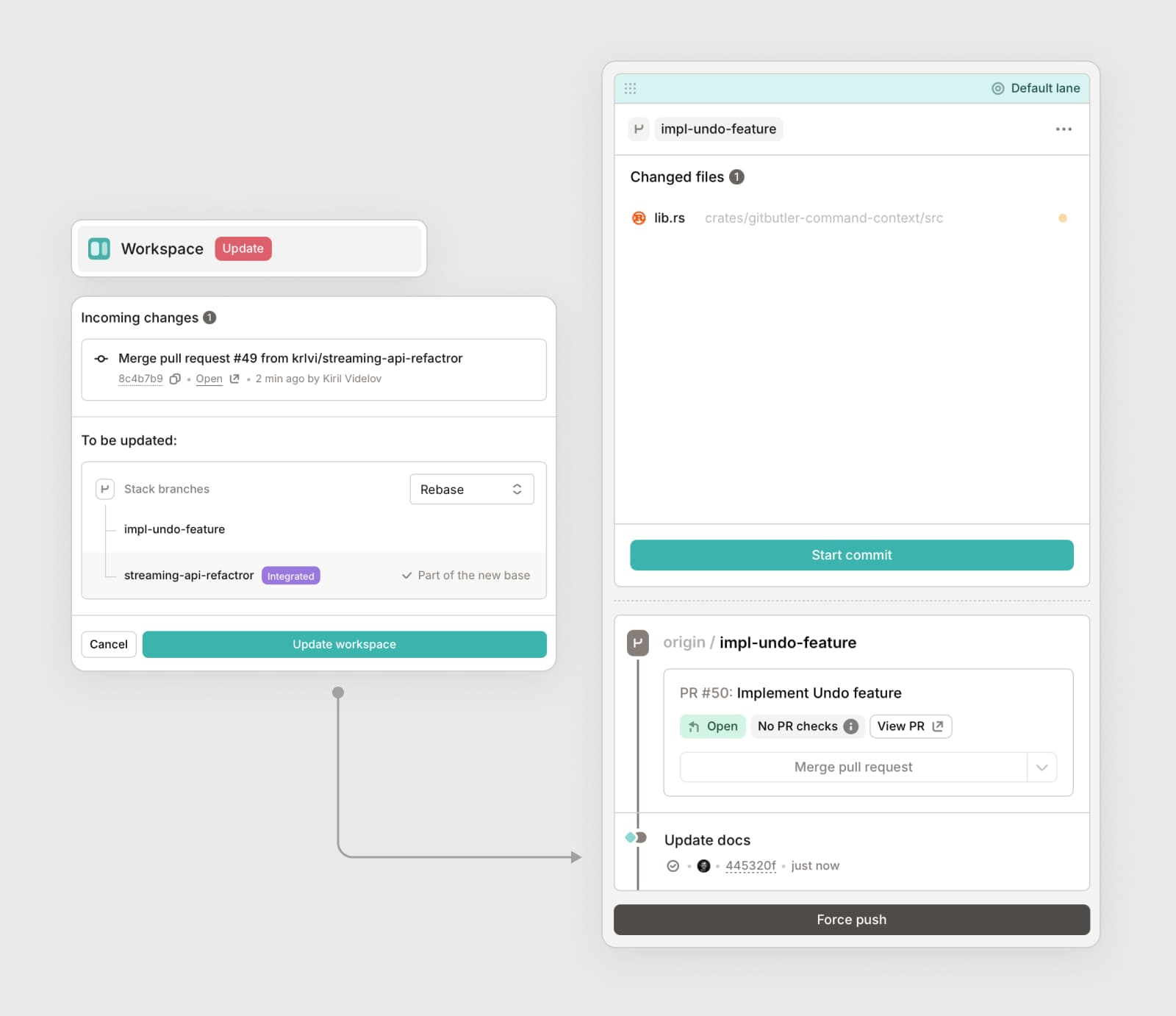 1. Review/merge your PRs starting from the bottom up. After a PR/branch from your stack has been merged, it is reflected in the Stack and you should force push to reflect the changes on the remote as well.
